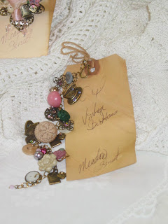...Beautiful tea time pins and a charm bracelet from Erica at Meadow Street. The pictures don't even do them justice. You have to see these to really appreciate the detail she puts into each one. Hand dyed silk made into gorgeous pink roses. Tiny charms. Vintage buttons. Antique silk ribbon fashioned into violets and rosebuds. I could go on and on...Each piece is a 3-D work of art!